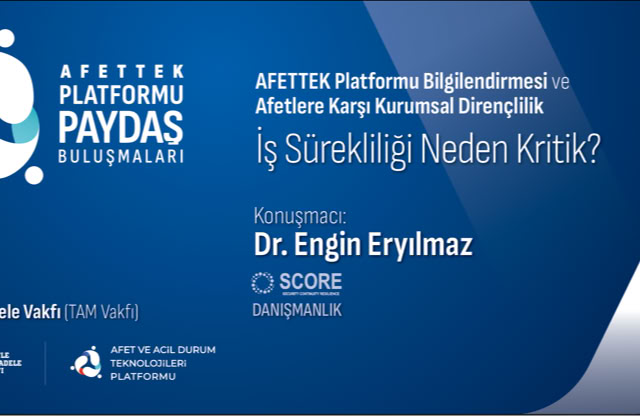 Ardından, Platform üyesi Score Danışmanlık Kurucusu Dr. Engin Eryılmaz tarafından “Afetlere Karşı Kurumsal Dirençlilik: İş Sürekliliği Neden Kritik?” başlıklı sunum gerçekleştirildi.